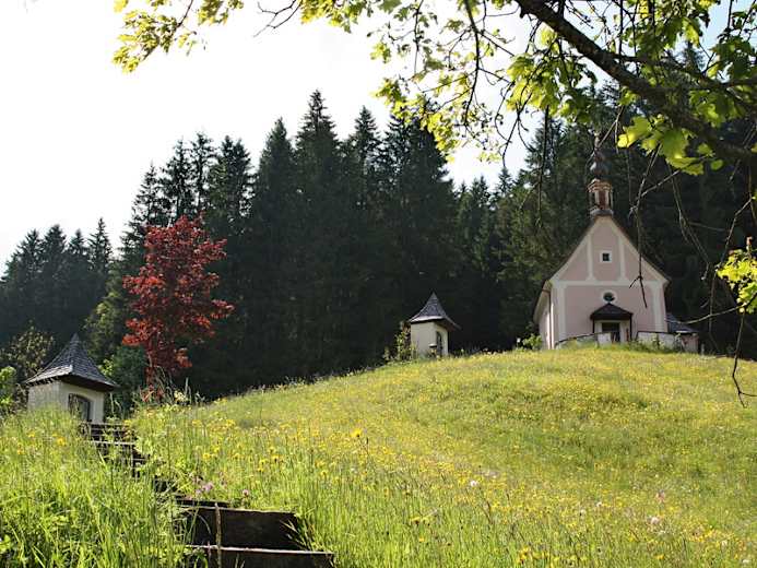 Hinter der Kapelle am Kalvarienberg startet der Herrenweg. Durch den Wald geht es auf dem Wanderweg 611 Richtung Zwieselalm auf ca. 1.500 m. Immer wieder bieten sich tolle Ausblicke auf das schöne Gosautal und gemütliche Rastplätze. Am Weg kreuzen die Bergbahnen „Hornspitzlift" und „Zwieselalm". Eine schöne Tour vom Tal auf die Zwieselalm.