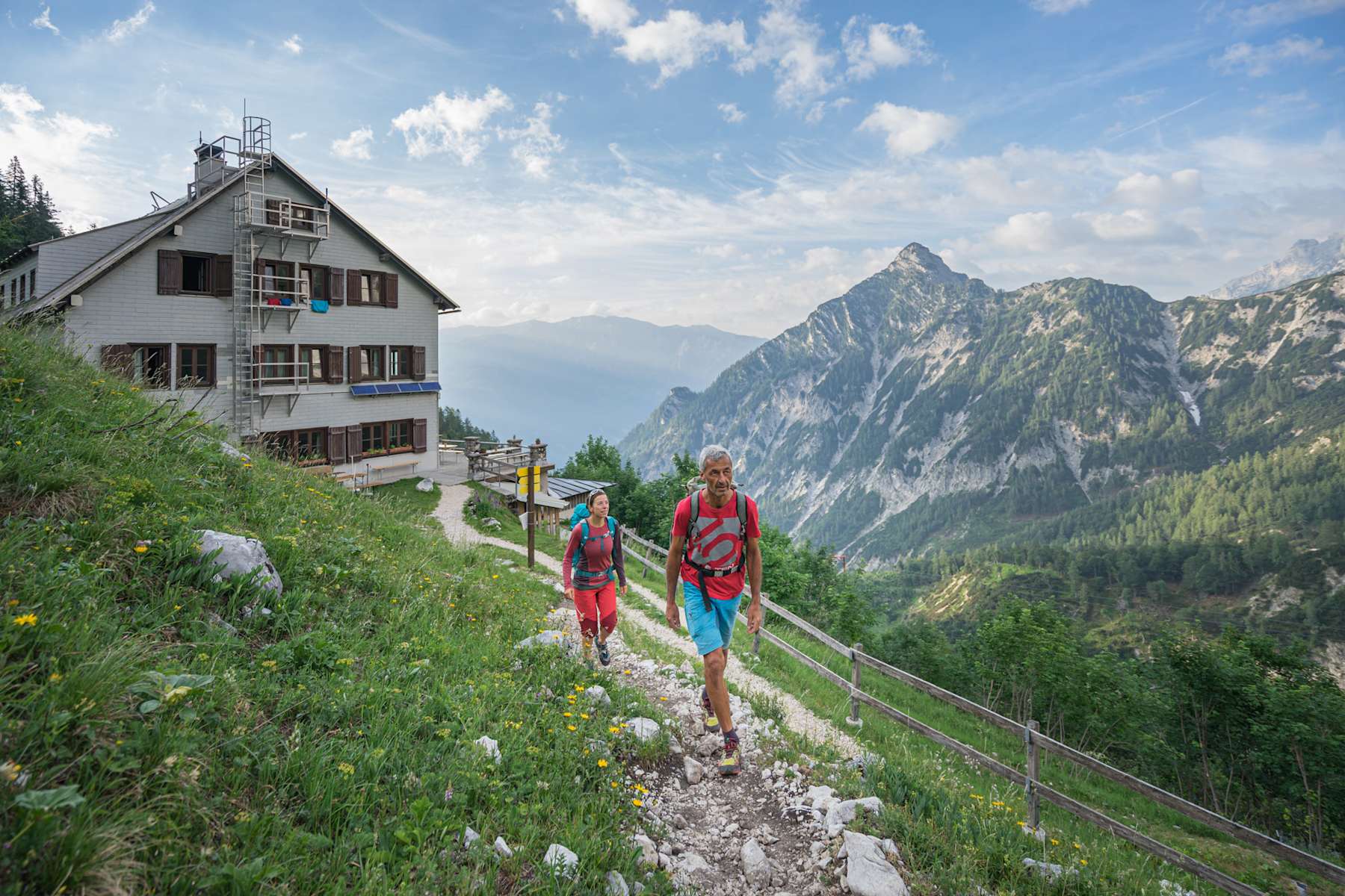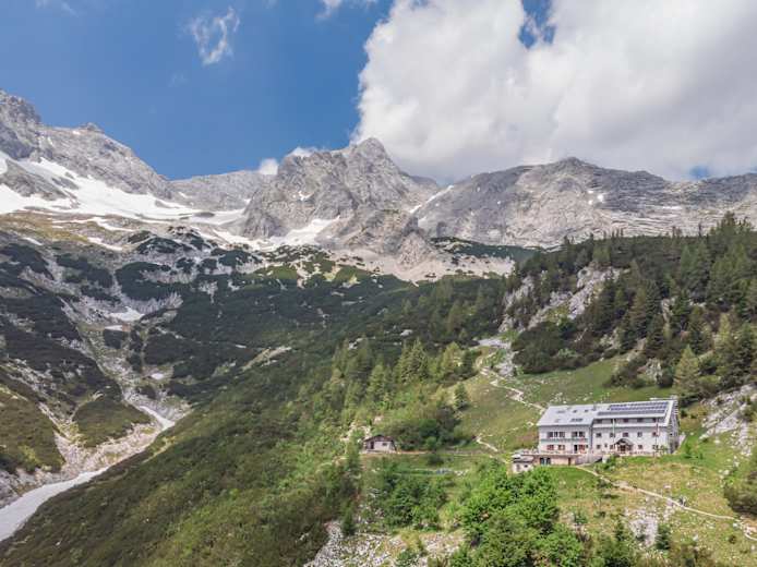 Weiter durch einen Buchenwald, teilweise in der Nähe der Materialseilbahn über eine Lichtung zum Prielschutzhaus. Die sonnige Terrasse lädt zum Verweilen vor der großartigen Bergkulisse ein.