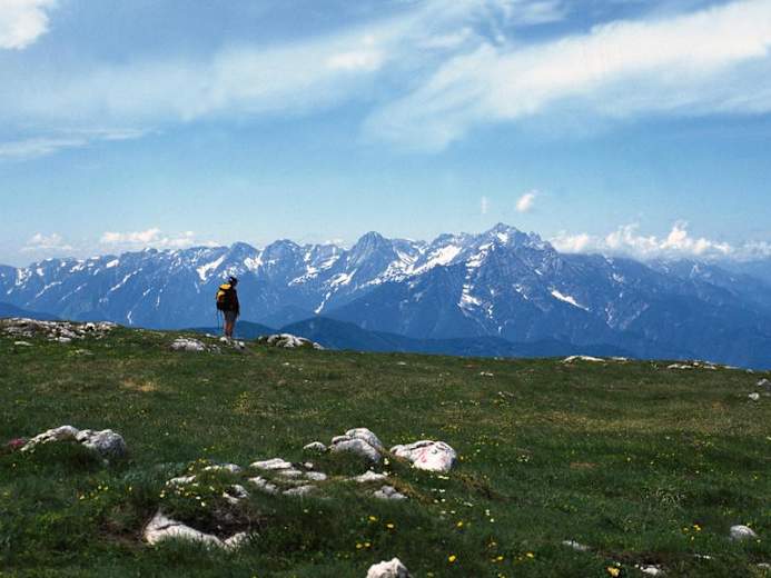 Ein Weg, wie er schöner nicht beginnen könnte. Man überquert den Rettenbach und schon ist man auf dem Steig, der sogleich und stetig durch dichten Wald bergauf führt. 30 Minuten später lichtet sich der Wald und gibt erste schöne Einblicke in den Budergraben frei, der zur Freude der Skitourengeher bis lang ins Frühjahr hinaus mit Schnee gefüllt ist. Dort, wo der Graben endet, wendet man sich nach rechts, quert ein breites Geröllfeld und erreicht auf etwa 1 600 m eine Markierungstafel. Hier mündet auch der Weg von der Koppenalm, den wir beim Abstieg gehen wollen. Durch Latschengassen steigt man höher, immer der Markierung Nr. 463 folgend, bis man flacheres Gelände erreicht.