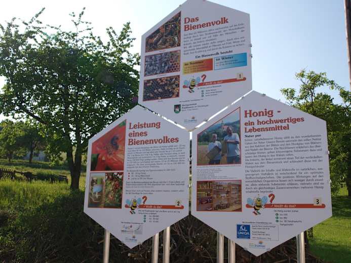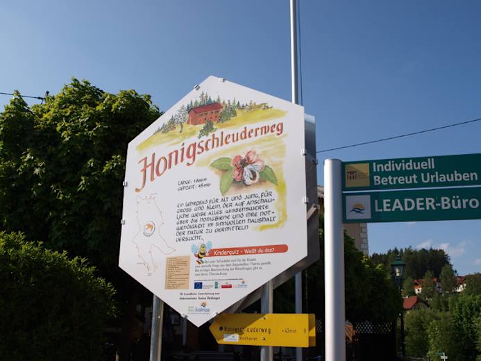 Die 1,5 km lange Wanderung am Honigschleuderweg Waldhausen ist ein Bienenlehrpfad, der Kinder und Eltern über das Leben der Bienen, aber auch über die Natur und Botanik informiert. Zahlreiche Stationen bringen die Lebensweise der Insekten, aber auch die Imkerei den Familien näher. Der Ausgangs- bzw. Endpunkt des Rundwanderweges ist der Gasthof Reutner am Schlossberg. Jede der 17 Stationen bringt eine neue Entdeckung mit sich, denn nicht nur Schautafeln säumen den Honigschleuderweg, auch Exponate und Modelle zum Anschauen und Anfassen sorgen für viel Abwechslung. Die Kinder befassen sich gerne mit dem Quiz, wo sie sich den Fragen zum Thema „Bienen und Natur“ stellen.