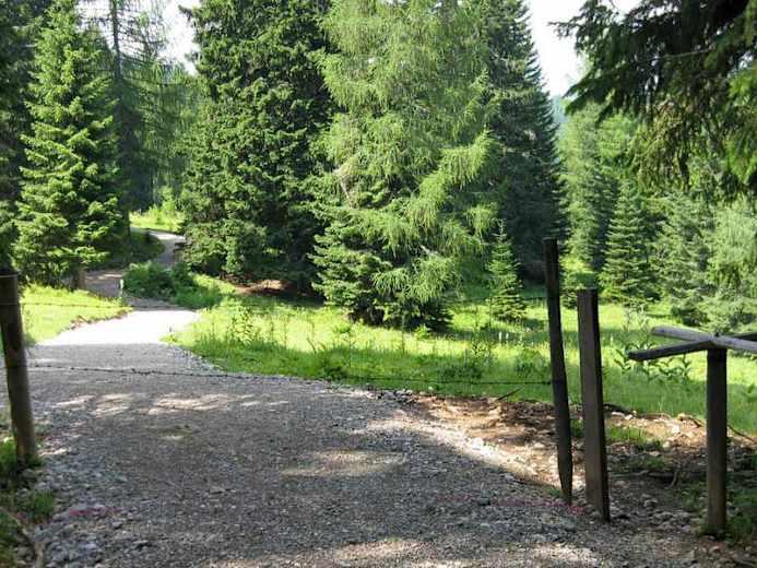 Der Wanderweg schlängelt sich durch alten Fichtenbestand am Fuße der Skipisten und gibt schließlich immer wieder den Blick auf die Kulisse des Toten Gebirges frei. Im letzten, leicht abfallenden Teil gelangt man bereits wieder zu den Almhütten im Zentrum der Hutterer Böden.
