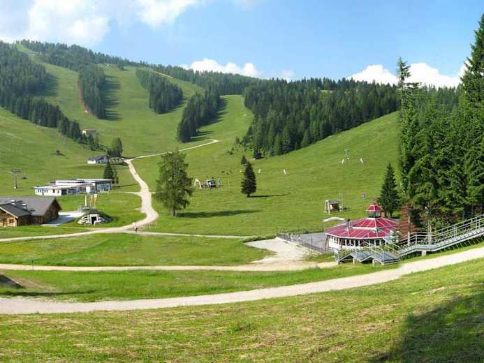 Vom Wegeinstieg Hutterer Böden ausgehend verbindet eine Schotterstraße die Alm- und Skihütten im Zentrum des Almplateaus mit der bewirtschafteten Edtbauernalm am östlichen Rand. Wenn hier auch der Almboden gut bewachsen ist, so zeigen sich doch einige trichterförmige Absenkungen im Gelände, auch Dolinen genannt, als typische Geländeform im Karst. Über Dolinen wird das Höhlensystem im Berg mit Oberflächen- und Schmelzwasser gespeist.