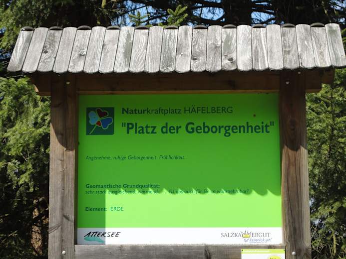 Gegenüber vom Reistall geht es schließlich rechter Hand auf der Karl-Hausjell-Allee über „Rittmeister Wiese“ zur Waldvilla. Von hier folgen wir dem gut ausgebauten Höhenweg bis nach Seeberg/Kammer. Dabei genießen wir immer wieder herrliche Ausblicke über den Attersee. Am Ende des Höhenweges setzen wir unsere Wanderung nach links fort und beginnen den Anstieg auf den Häfelberg. Am Gipfel des Häfelbergs finden wir den Glücksplatz „Platz der Geborgenheit“ vor.