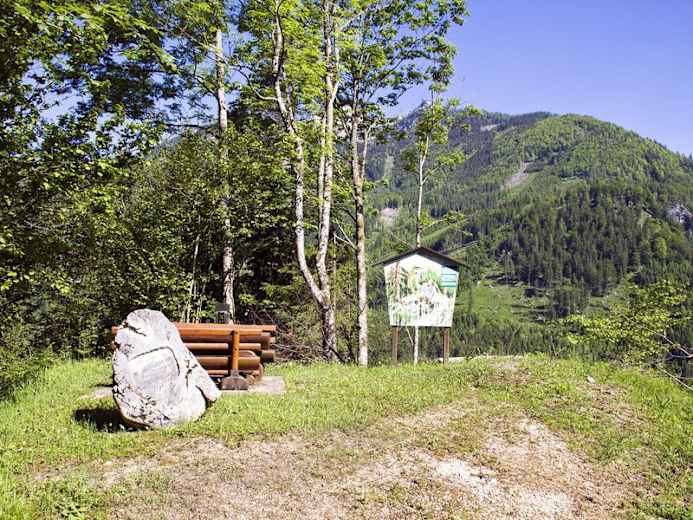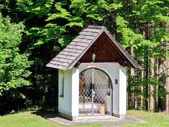 Nun wieder rechts kurz einen Rücken entlang gelangen sie zur Jaidhauser-Aussicht (Rubbel-Station, Rastbänke), die einen herrlichen Ausblick über den Ort Hinterstoder bietet. Wieder zurück zur Weggabelung und weiter durch Wald, leicht ansteigend, erreichen sie in wenigen Minuten die Hubertuskapelle mit schönem Aussichtsplatz mit Ruhebänken oberhalb der Panoramastraße. Die Straße rund einen Kilometer abwärts gelangen sie wieder zum Ausgangspunkt.