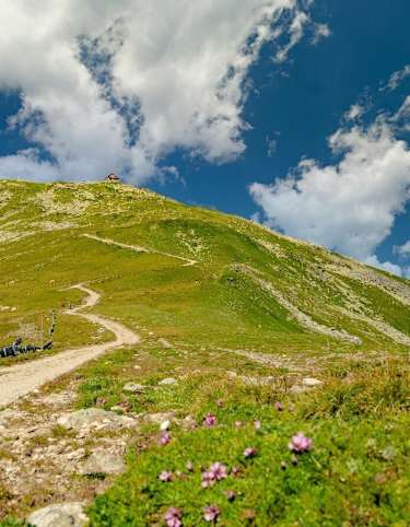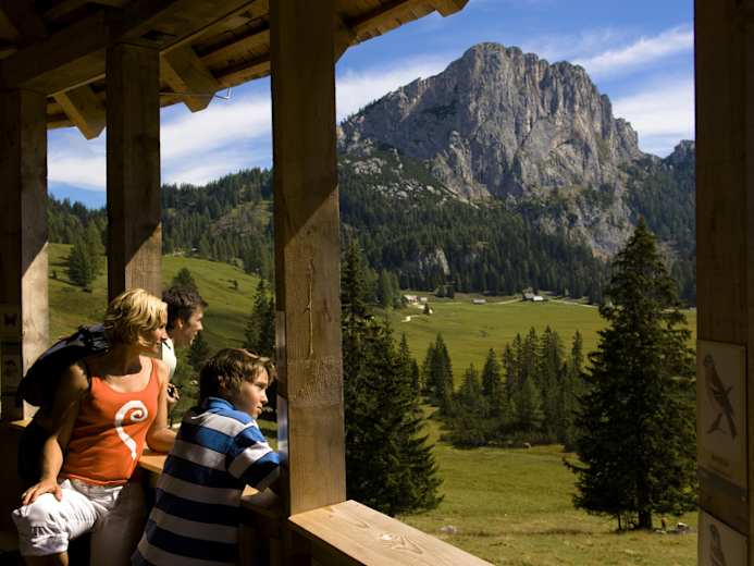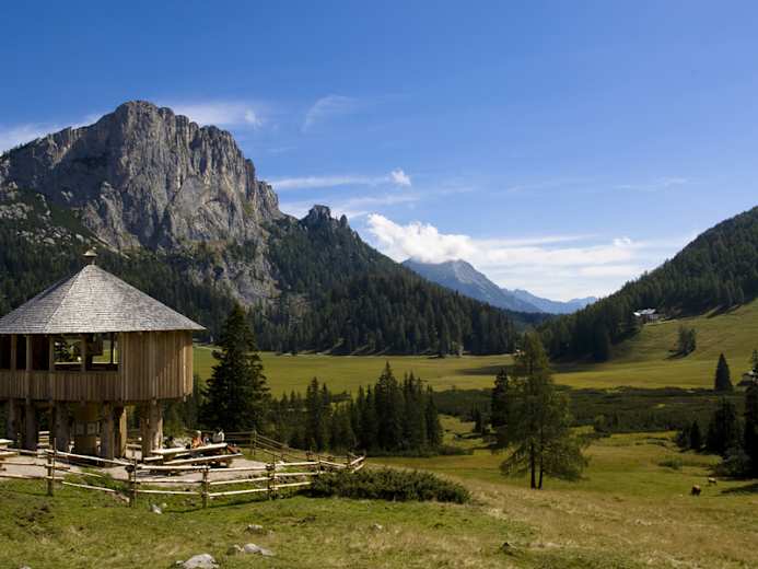 Vom Halssattel vorerst unter Felsen westlich absteigend in den so genannten Mausbachgraben wandern. Anschließend geht es meist flach in nördliche Richtung und zuletzt durch einen schütteren Lärchenwald leicht ansteigend, bis Sie das Etappenziel, die Dümlerhütte auf der Stofferalm, erreicht haben. Diese befindet sich in einer prächtigen Lage.