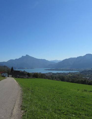 Nach einem Sattel und einer weiteren Wiese zweigen wir vom breiten Weg rechts ab und wandern wieder auf dem Kamm zu einer Asphaltstraße, auf der man in wenigen Minuten zur Kolomanskirche gelangt. Das Kolomansbründl liegt nicht weit entfernt am markierten Arnoweg (Richtung Irrsee). Abstieg auf der gleichen Route.MondseeDas ehemalige Kloster und jetzige Schloss Mondsee blickt auf eine lange Geschichte zurück. Schon kurz nach seiner Gründung im Jahre 739 durch den Bayernherzog Odilo II. wurde es zum Kristallisationspunkt der ganzen Region.