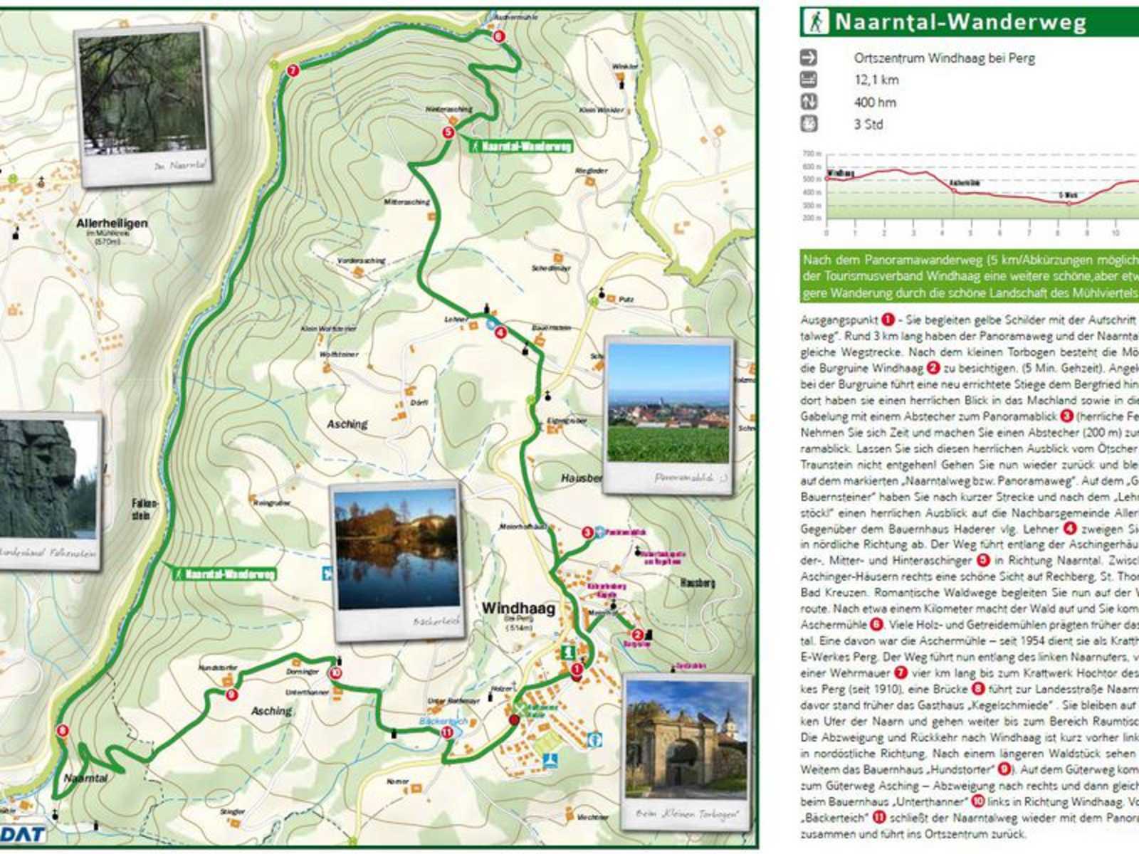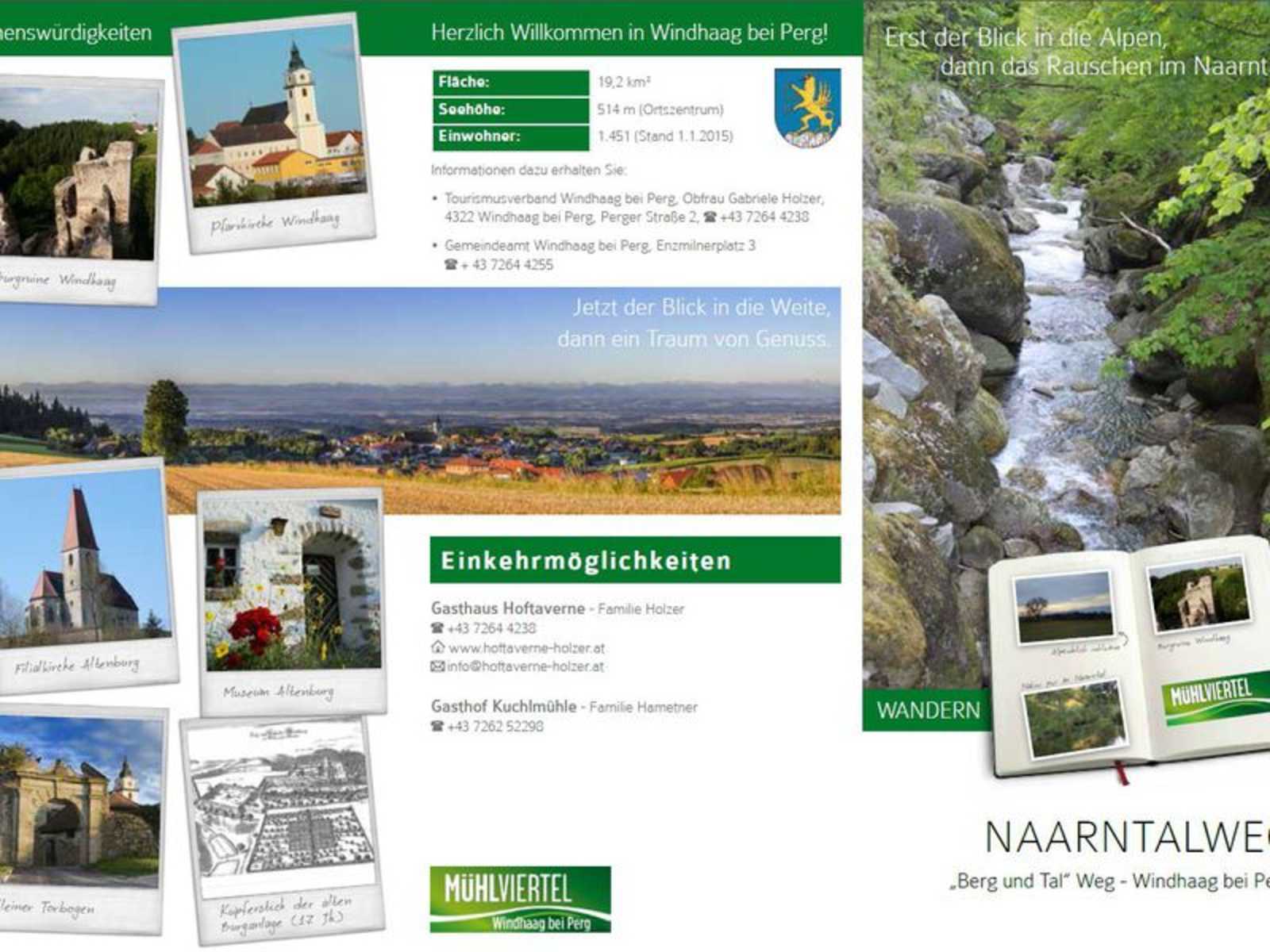 Der Weg führt nun entlang des linken Naarnufers, vorbei an einer Wehrmauer vier km lang bis zum Kraftwerk Hochtor des E-Werkes Perg (seit 1910), eine Brücke führt zur Landesstraße Naarntal. Kurz davor stand früher das Gasthaus „Kegelschmiede“ . Sie bleiben auf dem linken Ufer der Naarn und gehen weiter bis zum Bereich Raumtischmühle. Die Abzweigung und Rückkehr nach Windhaag ist kurz vorher links hinauf in nordöstliche Richtung. Nach einem längeren Waldstück sehen Sie vonWeitem das Bauernhaus „Hundstorfer“ . Auf dem Güterweg kommen Sie zum Güterweg Asching – Abzweigung nach rechts und dann gleich wieder beim Bauernhaus „Unterthanner“ links in Richtung Windhaag. Vorbei am„Bäckerteich“ schließt der Naarntalweg wieder mit dem Panoramaweg zusammen und führt ins Ortszentrum zurück.