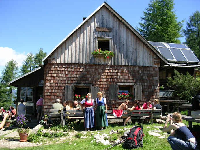 Eine Kehre der Forststraße wird geradeaus abgekürzt, dann führt der Weg über einen steilen und bewaldeten Rücken zur 1.375 m hoch gelegenen und bestens bewirtschafteten Gowilalm hinauf. Nun ist erst einmal eine Rast angesagt.