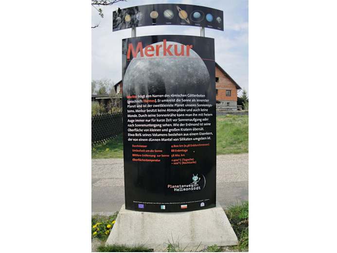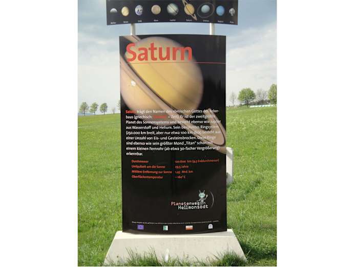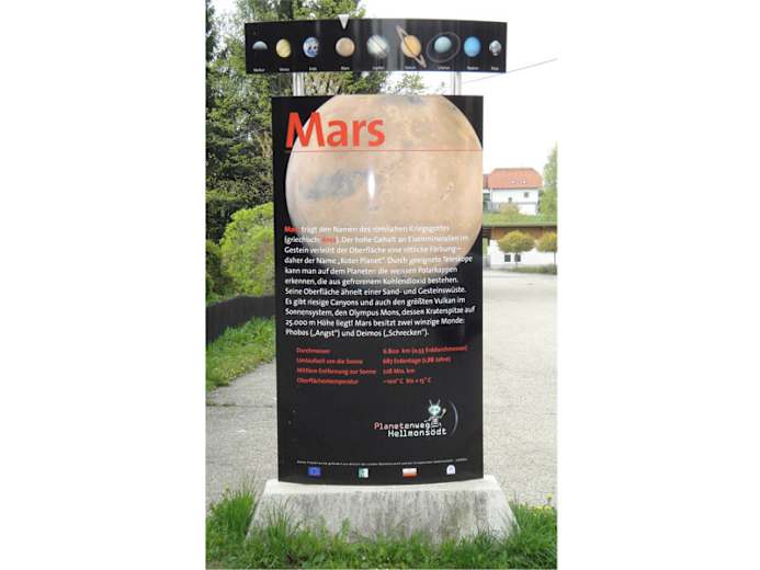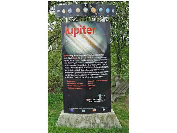 Im Jahre 2006 wurde der Jupiter-Standort Hellmonsödt mit einem Planetenweg bereichert. Auf einer Länge von rund 4,0 km wurde ein barrierefreier Rundwanderweg angelegt, an dem auf Schautafeln unsere 8 Planeten in maßstabsgetreuer Entfernung 1:440 Mio. km dargestellt werden und viele Informationen über unser Sonnensystem enthalten sind. Ergänzt werden die Stationen mit Spielplätzen mit Spielgeräten und Ruhebänken mit herrlichem Blick auf Hellmonsödt. Start und Ziel unseres "Spazierganges durch das All" ist die Sonne am Kinderspielplatz. In unmittelbarer Nähe sind ausreichend Parkplätze vorhanden. Radfahrer finden Fahrradständer vor. Schmankerl und Gaumenfreuden werden Ihnen in den Gastbetrieben in Hellmonsödt angeboten. Wir freuen uns auf Ihren Besuch.