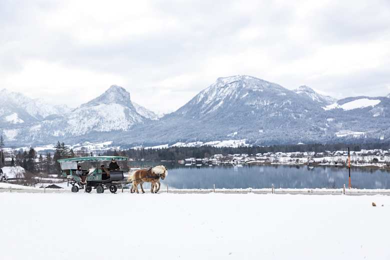 Gemütliche und romantische Winterwanderung entlang des Wolfgangsees im Salzkammergut, die sich für die ganze Familie eignet.