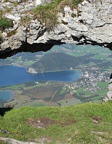 Nachdem man sich etwas erholt hat, steigt man weiter durch den Wald aufwärts, meistert eine Steilstufe mittels einer Eisentreppe, die mit Seilsicherungen versehen ist und gelangt kurz darauf zum Rastplatz "Bründl". Der schöne Blick auf den tief unten liegenden Offensee entschädigt für die Anstrengung.