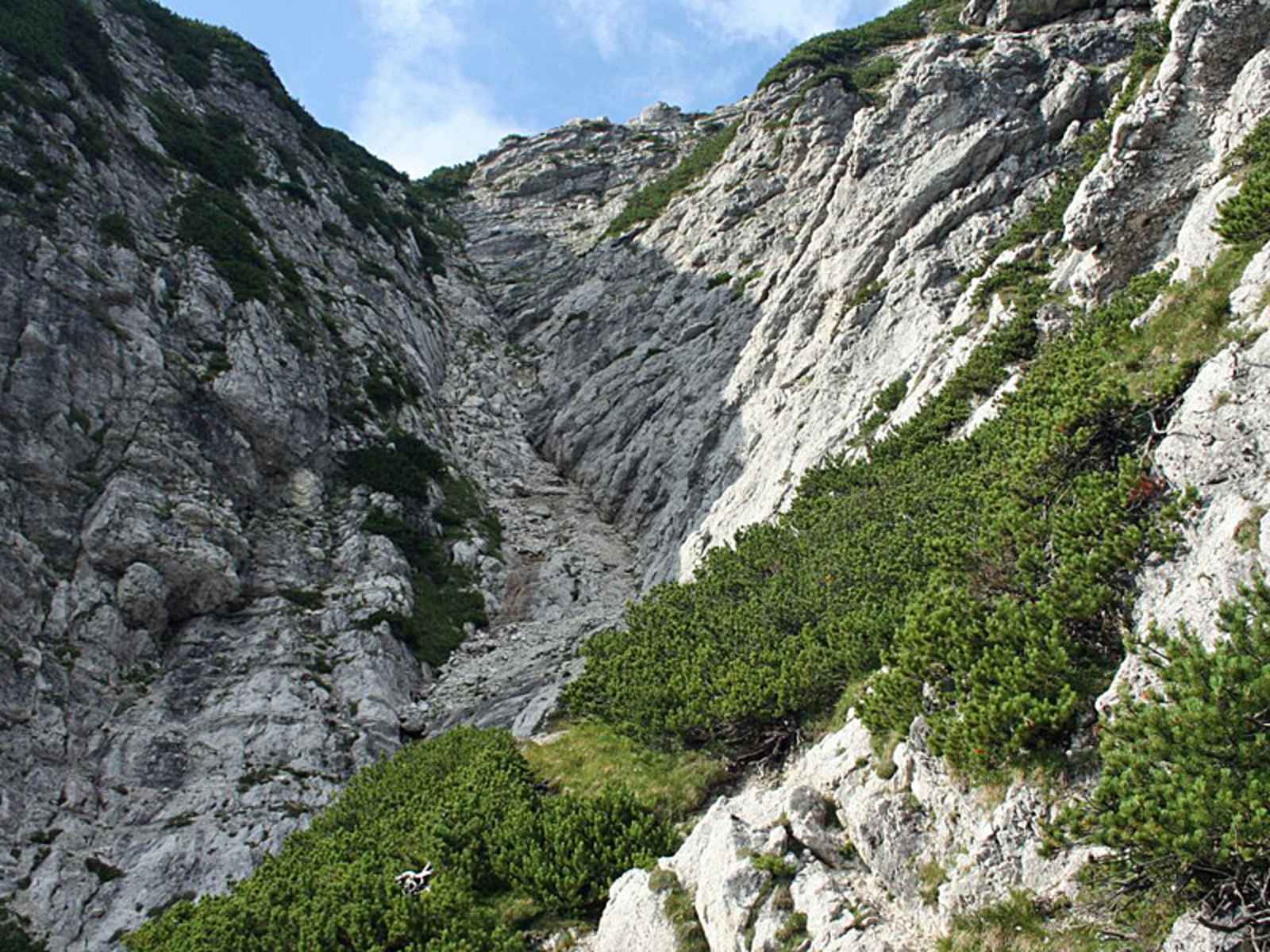 Über diesen Steig folgen, bis zum flacheren Sonntagstrieb weiter bis zur Westschulter. Diese erreicht man nach einer steilen Felspassage, die mit Seilen gesichert ist. Auf der Westschulter weiter dem Grat folgen, noch einige Seilsicherungen, bis zum Gipfel.