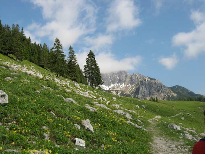 Man wandert zunächst von der Seilbahnstation zur Gablonzer Hütte auf 1.550 m und weiter zur Wegteilung im Unteren Törlecksattel. Damit hat man die meisten Höhenmeter bereits geschafft. Auf dem rechts abwärts führenden Austriaweg durch felsdurchsetzte Grashänge und ein Waldstück zur Stuhlalm, oder auch zur nahen, im Wald versteckten, Theodor-Körner-Hütte.