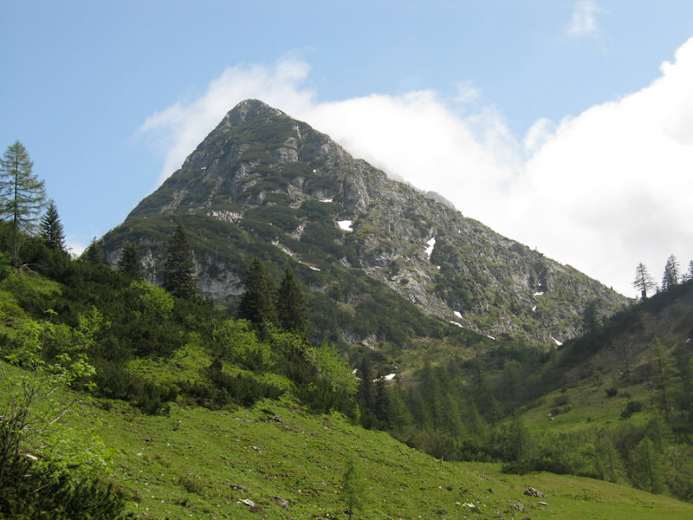Über den Grasrücken oberhalb der Alm (Mooseben) ins latschenbewachsene Grubach unter dem Stuhlloch und durch eine schmale, mit Holzstufen und Stahlseil gangbar gemachte Schlucht („Durchgang“), ins Jöchl hinauf. Dann fast eben unter den felsigen Ausläufern der Bischofsmütze (Stahlseile) zum Mahdalmriegel, dort nach links und durch die weiten Gras- und Geröllhänge oberhalb der Sulzkar- und der Retteneggalm zur schon weithin sichtbaren Hofpürglhütte. Die Hütte steht landschaftlichen besonders schön und bietet einen wunderbaren Blick auf das Dachsteinmassiv. Ein schöner Übernachtungsstützpunkt mitten in einer imposanten Bergnatur.