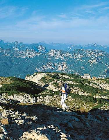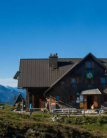 Nun geht ist es ein teilweise mit Drahtseilen gesicherter Steig, der von einer romantischen Felsszenerie umgeben ist, empor. Die letzten 100 Meter gehen Sie mühsam über ein Geröllfeld zum Salzsteigjoch. Ein herrlicher Rückblick ins Stodertal lohnt die Mühen.Südlich vom Salzsteigjoch führt der Weg auf der steirischen Seite leicht fallend über Almböden und durch schütteren Lärchenwald zur Leisthütte.