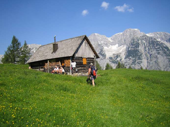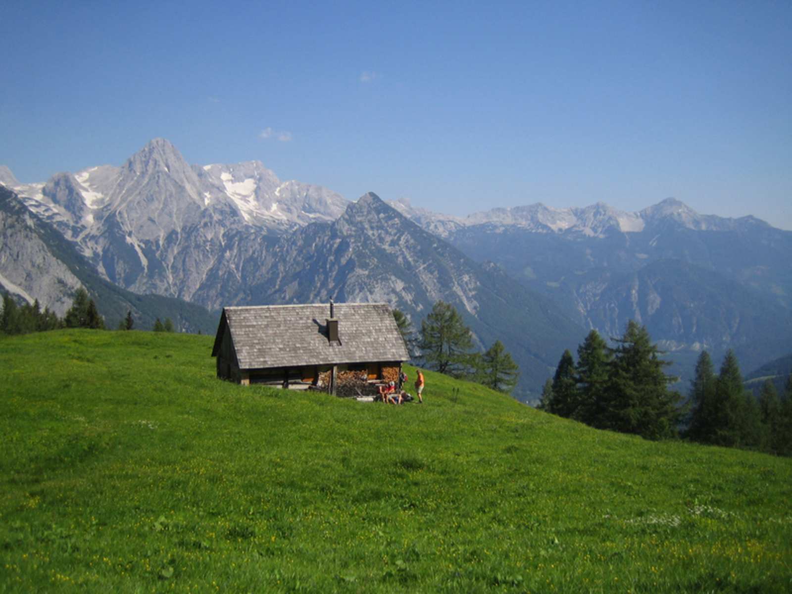 Im Sattel ist die erste Hälfte des Anstiegs zur Alm erreicht und eine kleine Rast, mit einem Abstecher auf den vor gelagerten Felsen, sollte man sich unbedingt gönnen, die Aussicht und der Tiefblick ins Tal sind atemberaubend. Schattig und steil geht es weiter im Buchenwald hinauf, bis sich der Wald lichtet und man nach den ersten freien Almwiesen die unbewirtschaftete Hochsteinalm (1.296 m) erreicht.