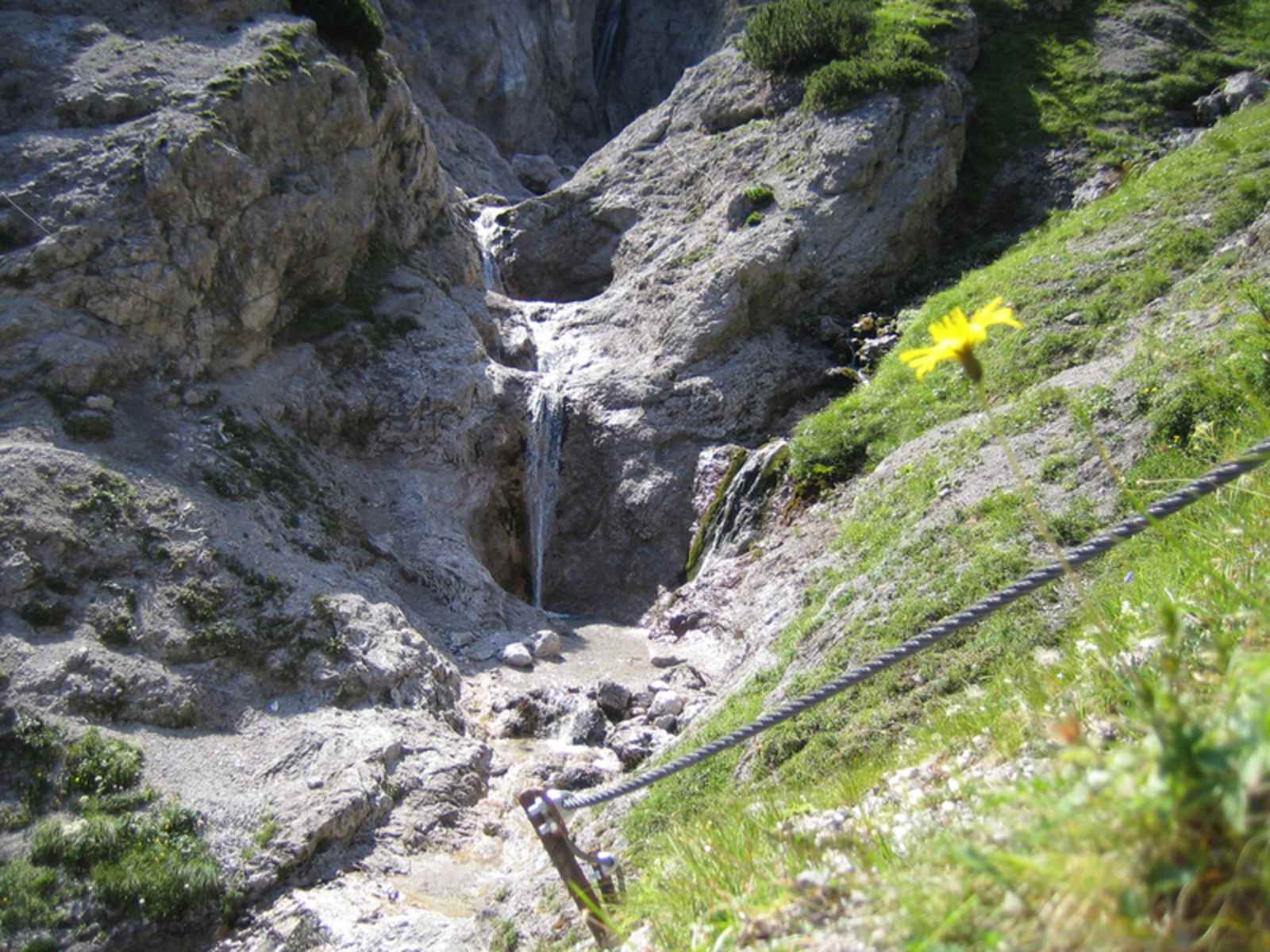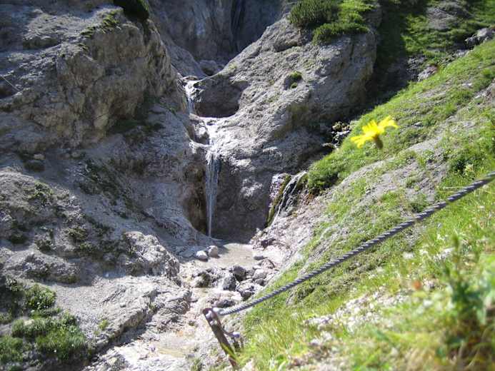 Im zunehmend felsigen Terrain nähert man sich dem seilgesicherten Abstieg in den Schwarzgraben und hört von weitem schon das Rauschen der kleinen Wasserfälle. Eine zweite, neu angelegte, äußerst romantische Variante führt gesichert direkt entlang der Gumpenkaskaden, die an heißen Tagen zu einem erfrischenden Bad in kristallklarem Wasser einladen. Geruhsamer Abstieg durch einzigartige Landschaft. Technisch weniger anspruchsvoll präsentiert sich der Wegverlauf im weiteren überaus abwechslungsreich.