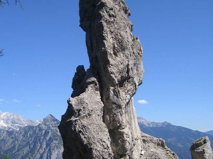 Oberhalb der Lögeralm beginnt nun der eigentliche Dolomitensteig, der im folgenden Abschnitt unbedingt Bergerfahrung und Schwindelfreiheit erfordert. In leichtem Auf und Ab zieht der schmale Steig entlang steiler Felswände, in Gräben, über Kuppen, vorbei an Wasserrinnen und bizarren Felsformationen. Hier wird klar, woher der Dolomitensteig seinen Namen hat: Das brüchige Kalkgestein, der Dolomit, mit seinen schroffen Felsen und Geröllhalden zeigt sich hier typisch, wie in einem geologischen Bilderbuch.