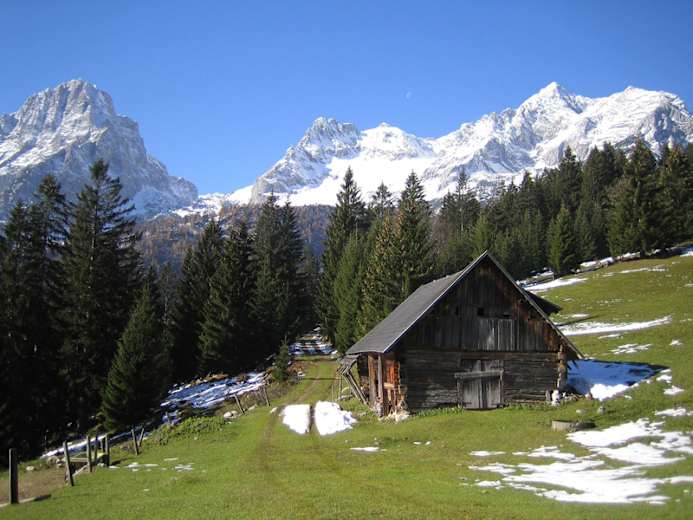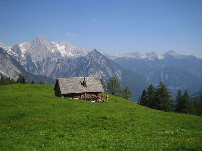 Das wohl verdiente Jausenplatzerl bei der Lögerhütte (unbewirtschaftet) liegt schon gut sichtbar nur wenige Gehminuten durch den lichten Lärchenwald entfernt. Nach zirka 600 absolvierten Höhenmetern lädt ein Bankerl vor der Almhütte zur gemütlichen Rast ein, wobei die Aussicht auf die majestätischen Bergriesen, deren Flanken durch wilde Täler zerfurcht sind, wirklich faszinierend ist.
