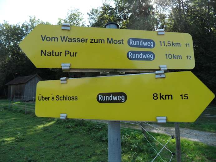 Vom Marktplatz geht es Richtung Almegg (Steinerkirchen) bis zur Almbrücke, dann rechts entlang der Alm (Naturschutzgebiet!) bis zum Penninger Steg (Laufmeile). Von dort geht es weiter bis zur Pettenbacher Landesstraße (Abstecher zur Laudachmündung nur 3 min). Die Laudachbrücke muss überquert werden. Der Gasthof Watschinger lädt zur Rast ein. Nach einer zünftigen Stärkung geht es weiter zum Autohaus Müller, rechts den Waldweg zur Haltestelle Blankenberg (Stern & Hafferl-Lokalbahn), über die Leit’n vorbei beim Naturdenkmal „Tuffquelle“. Von dort führt der Rundweg über den Feldweg Kößlwangerstraße – Wegkreuz – Richtung Ortschaft Aigen, wo ein wunderschöner Ausblick zum Toten Gebirge geboten wird. Weiter der Beschilderung folgend zum Biobauern Saalachhof (Fam. Ennser – eine gemütliche Einkehrstation für Mostdurstige) auf der Saalachstraße Richtung Bad Wimsbach zum Sport- und Schuhzentrum Hochleithner. Links neben dem Geschäft befindet sich die Mostschank Huemer (Fr-So ab 16:00 Uhr geöffnet) oder gleich zurück zum Ausgangspunkt, dem Marktplatz, wo neben den Einkehrmöglichkeiten (Café Konditorei Jöchtl, Wirtshaus Staudinger oder Bäckerei Bachinger) auch kulturell Interessantes wartet. So kann die Pfarrkirche St. Stephanus, das Naturdenkmal Kastanienallee oder die Hackenschmiede besucht werden.