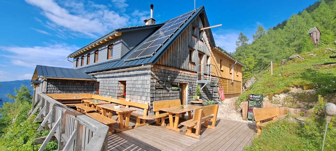 Nun wird es deutlich steiler, der Weg führt zum Teil in vielen Serpentinen durch den Wald aufwärts. Immer wieder erhascht man schöne Blicke auf das Priel-Gebirge, ehe man die Zellerhütte erreicht, die mit herrlicher Sonnenterrasse, traumhafter Aussicht und Übernachtungsmöglichkeiten aufwarten kann.