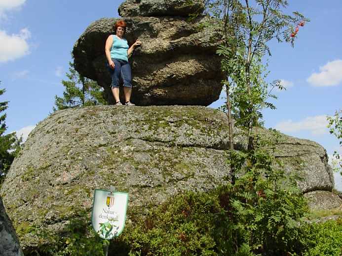 Königswiesen - Richtung Westen - Unterweißenbacher Straße - Rumetshofer, Kronbachtal - Pechölstein - Wackelstein (Gesteinsblock mit besonders kleiner Auflagefläche - Entstehung durch Verwitterungsprozesse, Wollsackverwitterung, vor über 1,5 Mill. Jahren; Mit 11 m Umfang einer der größten des Mühlviertels), herrliche Aussicht - Schröfhag - Kroneder - Königswiesen