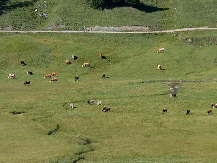 Vor dem Halssattel könnte man einen Abstecher, rechts abzweigend über steile Almwiesen und schütteren Lärchen- und Latschenbewuchs zum Stubwieswipfel (1.786 m) machen, wo man eine herrliche Aussicht genießt.
