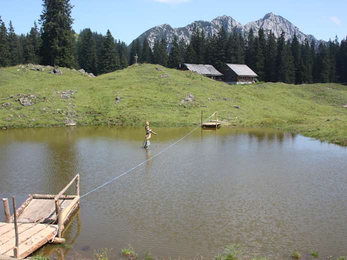 Nachdem wir das Hochplateau mit dem Bummelzug erreicht haben, beginnt die Wichtelwanderung direkt vor der Leutgebhütte auf der Plankensteinalm. Entlang des Wichtelweges warten einige Attraktionen, bei denen die Kinder selber aktiv sein können. Mit einem Floß wird der Wichtelsee überquert, dem Almwichtel kann man bei der Heuarbeit helfen und dem Holzknechtwichtel bei der Waldarbeit über die Schulter schauen. Auch der Jägerwichtel braucht eure Hilfe, um endlich den Wildererwichtel zu erwischen.Mit etwas Glück kann man auch die Pferde, welche auf der Plankensteinalm zu Hause sind, entdecken. Die ganze Tour wird von Wanderführerin Betty begleitet und die Aufgaben der Wichtel in einer Geschichte erklärt.Als Abschluss empfiehlt sich eine leckere Wichteljause in der bewirteten Plankensteinalm, bevor es mit dem Gosauer Bummelzug wieder zurück ins Tal geht.Wanderkarten zur Dachstein Salzkammergut Region bestellen ...