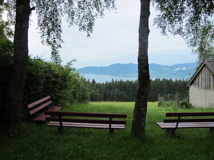 Dieser mündet nach einen paar Metern in eine ebene Forststraße wo wir rechts einbiegen und entlang gehen. Am Ende des Waldpfades biegen wir noch enmal rechts ab und gehen talwärts bis zum Kronberg Kirchlein. Von hier genießt man einen herrlichen Blick über den Attersee und den Attergau.