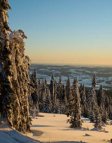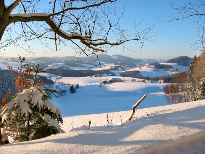 Die Winterwanderung auf gewalzten Wegen im oberösterreichischen Mühlviertel führt ausgehend von Oberschwarzenberg entlang der verschneiten Hügel des Böhmerwalds über die Grenze nach Deutschland und in einem Bogen zurück zum Ausgangpunkt.