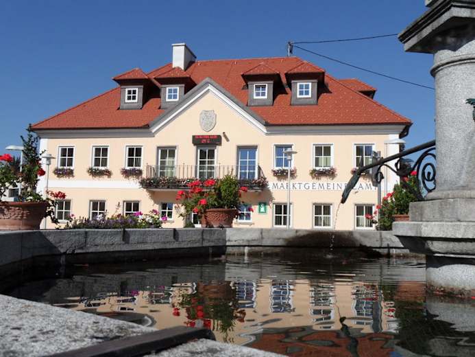 Marktplatz von Bad Wimsbach-Neydharting. (Kurzparkzone während der Woche). Langzeitparkplätze sind beim Bahnhof (3 Gehminuten vom Marktplatz) oder bei der Pfarrkirche (oberhalb Marktplatz).