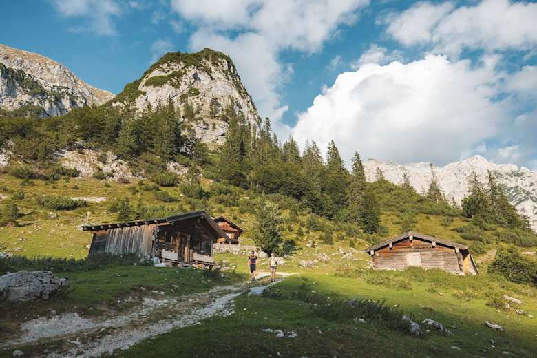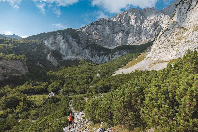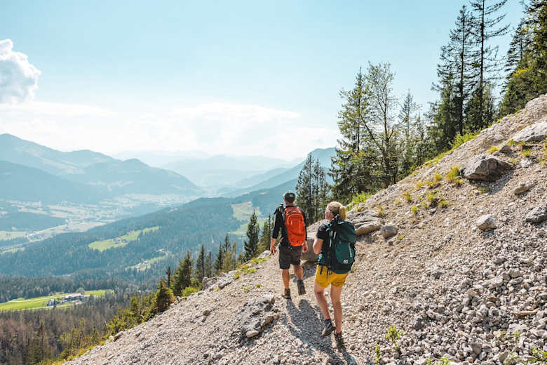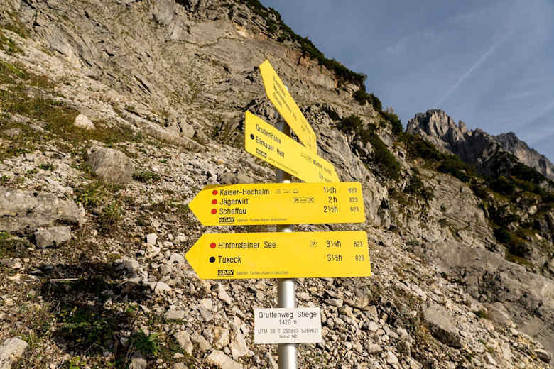 Von der Gruttenhütte starten Sie Richtung Westen auf dem Fahrweg 14a und biegen nach ca. 30 Minuten über ein paar Stufen auf den Wilder-Kaiser-Steig (WKS) 823 unterhalb des Kaiserkopfes. Bleiben Sie nordwestlich auf dem WKS und wandern unterhalb der Kaisergipfel Treffauer und Tuxeck über das Lenggries (eines der größten Schotterkare am Wilden Kaiser) durch duftende Latschen und Bergwälder, die Kitzbüheler Alpen und die Gletscher der Hohen Tauern dabei immer im Blick.