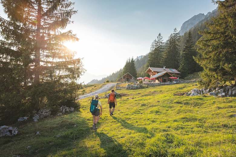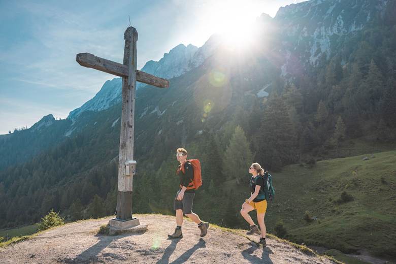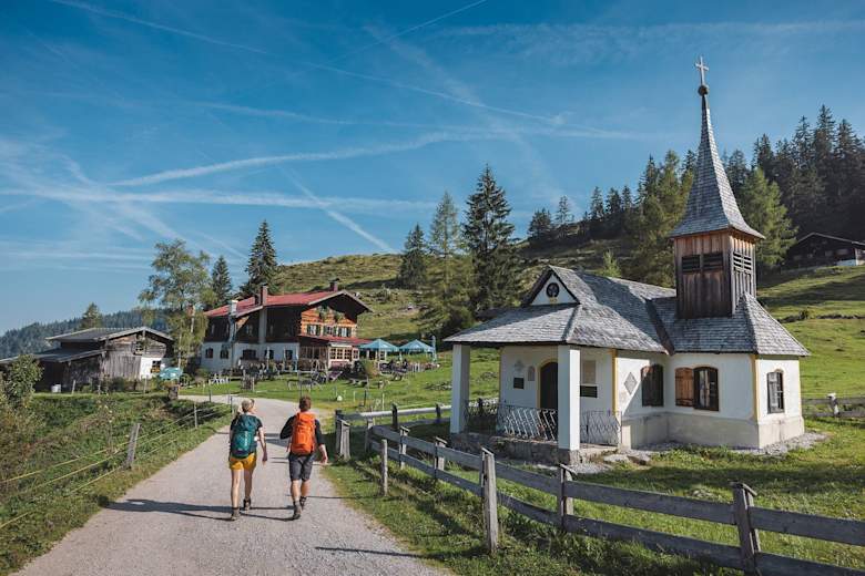 Anschließend wandern Sie auf dem Steig 827 über Almwiesen vorbei am Jägerbrünnl und durch den Wald zum Kreuz am Hochegg (1.470 m). Von hier geht es weiter, leicht bergab über sanfte Almen bis zur gemütlichen Kaindlhütte (1.293 m), auf der Steinbergalm, einem wunderschönen Hochplateau oberhalb Kufsteins. Lassen Sie den Tag gemütlich ausklingen, während die Gipfel von Scheffauer und Zettenkaiser im Abendrot glühen.