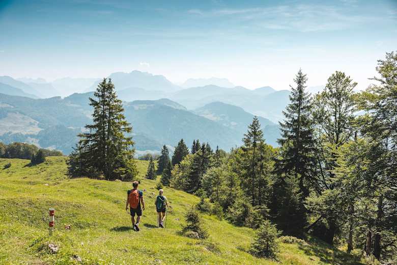 Der Steig 825 führt Sie nördlich über einen latschenbewachsenen Kamm. Bei der Abzweigung Feldberg/Stripsenkopf halten Sie sich rechts Richtung Feldberg und bei der nächsten Abzweigung wandern Sie ca. 10-15 Minuten westwärts bis Sie zum Aussichtspavillon des Stripsenkopfes (1.807 m) gelangen. Von hier können Sie die Gipfel und Felswände des Wilden Kaisers in voller Pracht genießen! Bei klarer Fernsicht zeigt sich sogar der Chiemsee im Norden, die Loferer und Leoganger Steinberge im Süden sowie das Karwendel im Westen.