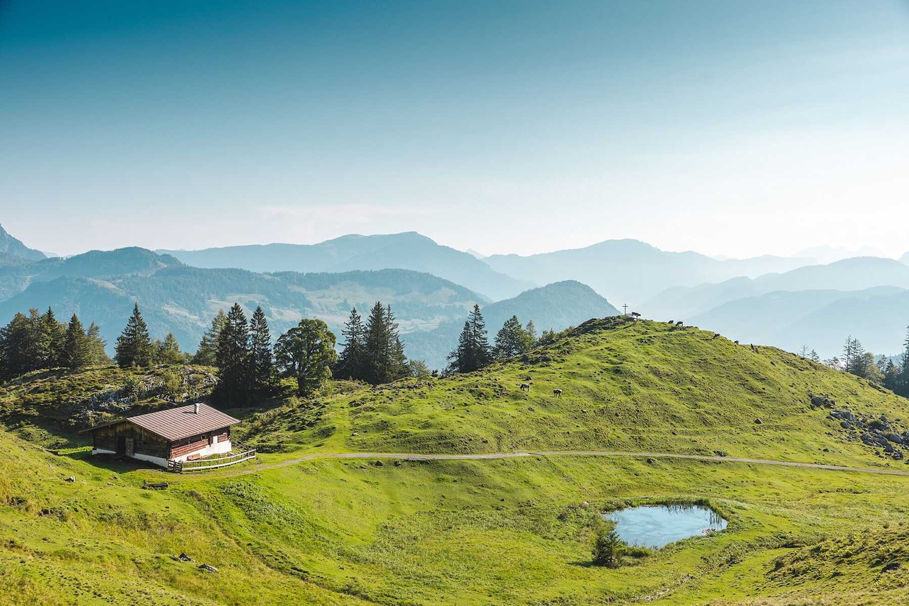 Über sanfte Almlandschaft geht es vorbei an idyllischen Almhütten und am beeindruckenden Schleierfall zum Ausgangspunkt der Kaiserkrone-Wanderung in Going, Hüttling.