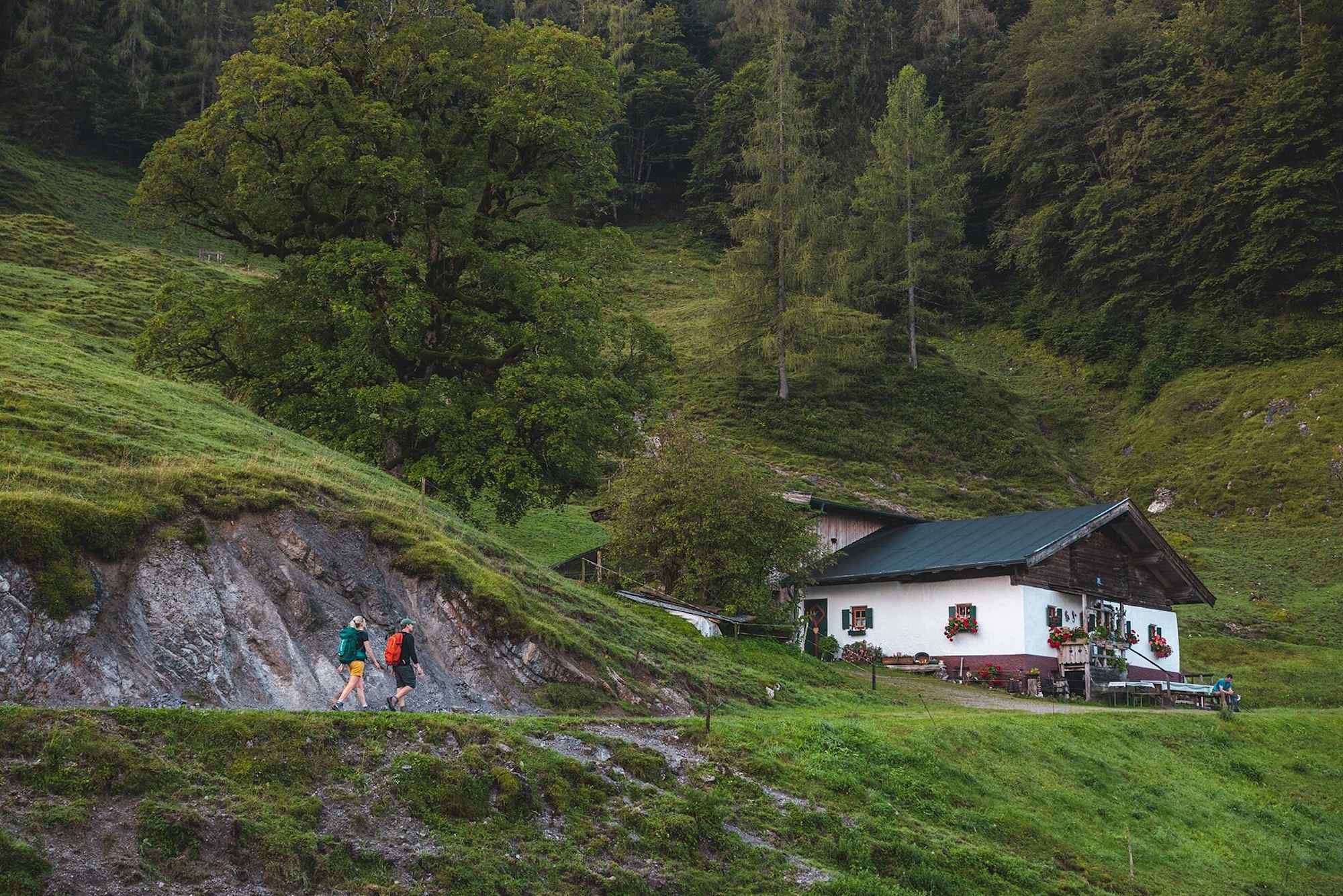 Über einige Stufen wandern Sie am Wilder-Kaiser-Steig bergab und bergauf weiter bis zum Gscheuerkopf (1.280 m). Von hier führt der Steig, teilweise ausgesetzt und mit Stahlseilen und Eisenklammern versichert, weiter über herrlich weichen Waldboden zu einer sanften Almenlandschaft. Folgen Sie dem Forstweg vorbei an der Einödalm und der Kaiser-Niederalm und später dem Steig 819 in südwestlicher Richtung zur Granderalm. Die genannten Almen sind alle nicht bewirtschaftet.
