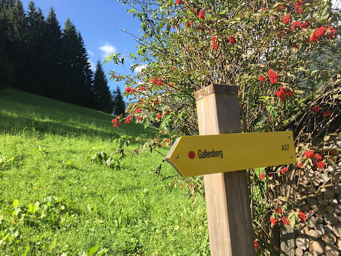 Man startet am Parkplatz der Pöglbahn und geht vorbei am Hotel Galtenberg in Richtung Heimatmuseum. Dann geht es auf dem Weg A37 weiter. Man wandert zur Jagdhütte Alplkreuz, über den Bergrücken bis zur Weggabelung und dann weiter zum Großen Galtenberg. Für den Abstieg geht man zurück bis zur Weggabelung. Dann wandert man links in Richtung Farmkehralm und über den Jagdsteig zur Stettaueralm und zurück zum Startpunkt.