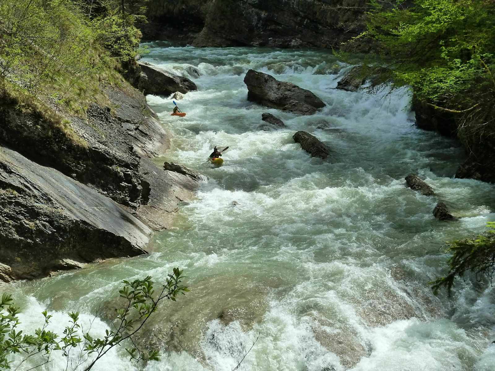 Der Wanderweg führt am linken Ufer durch schönen Bergwald. Bald wird es aber richtig imposant: die Felswände rücken näher und näher, tief unten rauscht das Wasser durch den Felsen. Gelegentlich sieht man Kajakfahrer, die sich dieser Herausforderung stellen.