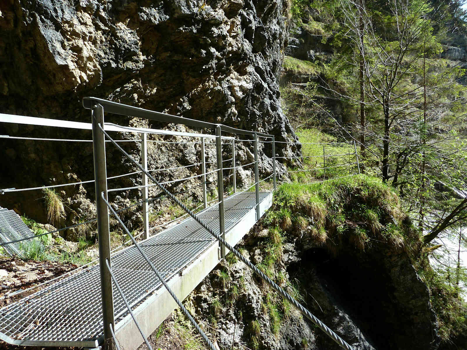 Von der Straße führt ein Waldsteig hinunter zur Ache. Hier am Anfang der Klamm präsentiert sich der Fluss ruhig und weite Schotterbänke laden zum Spielen ein.