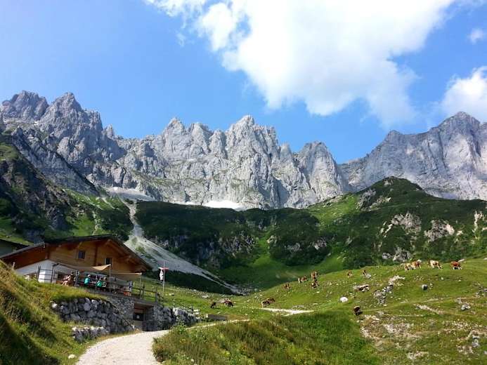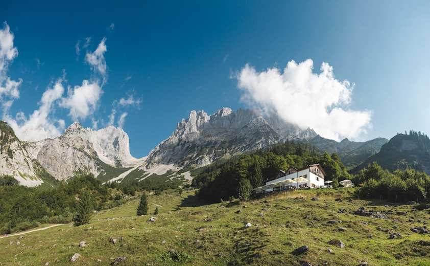 Weiter geht es vorbei an den Kletterwänden zum Stiegenbach Wasserfall und zur Oberen Regalm (1.313 m) und über Almwiesen bergauf auf den Brennenden Palven (1.572 m). Hier wird man mit einer traumhaften Aussicht belohnt. Halten Sie auch kurz beim bekannten Bergsteigergrab inne, wo der „Koasamuch“ seine letzte Ruhestätte gefunden hat. Der Steig 824 führt abfallend westwärts zur Gaudeamushütte (1.263 m), welche für die selbstgemachten Schmankerln und die herrliche Aussicht auf das Ellmauer Tor bekannt ist.