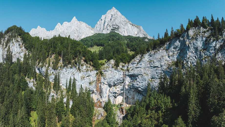 Weiter geht es entlang des steil ansteigenden Forstweges bis zur Kreuzung „Schleierwasserfall“. Hier beginnt der Steig über Almen und Wald, bis Sie nach ca. 20 Minuten wieder auf den Forstweg kommen. Nun führt ein schmaler Steig, der Trittsicherheit erfordert, zum Kletterparadies Schleierwasserfall. Hier rieselt der Wasserfall wie ein Schleier vor den überhängenden Wänden – ein herrliches Naturschauspiel. Nutzen Sie diesen besonderen Platz für ein perfektes Urlaubsfoto!