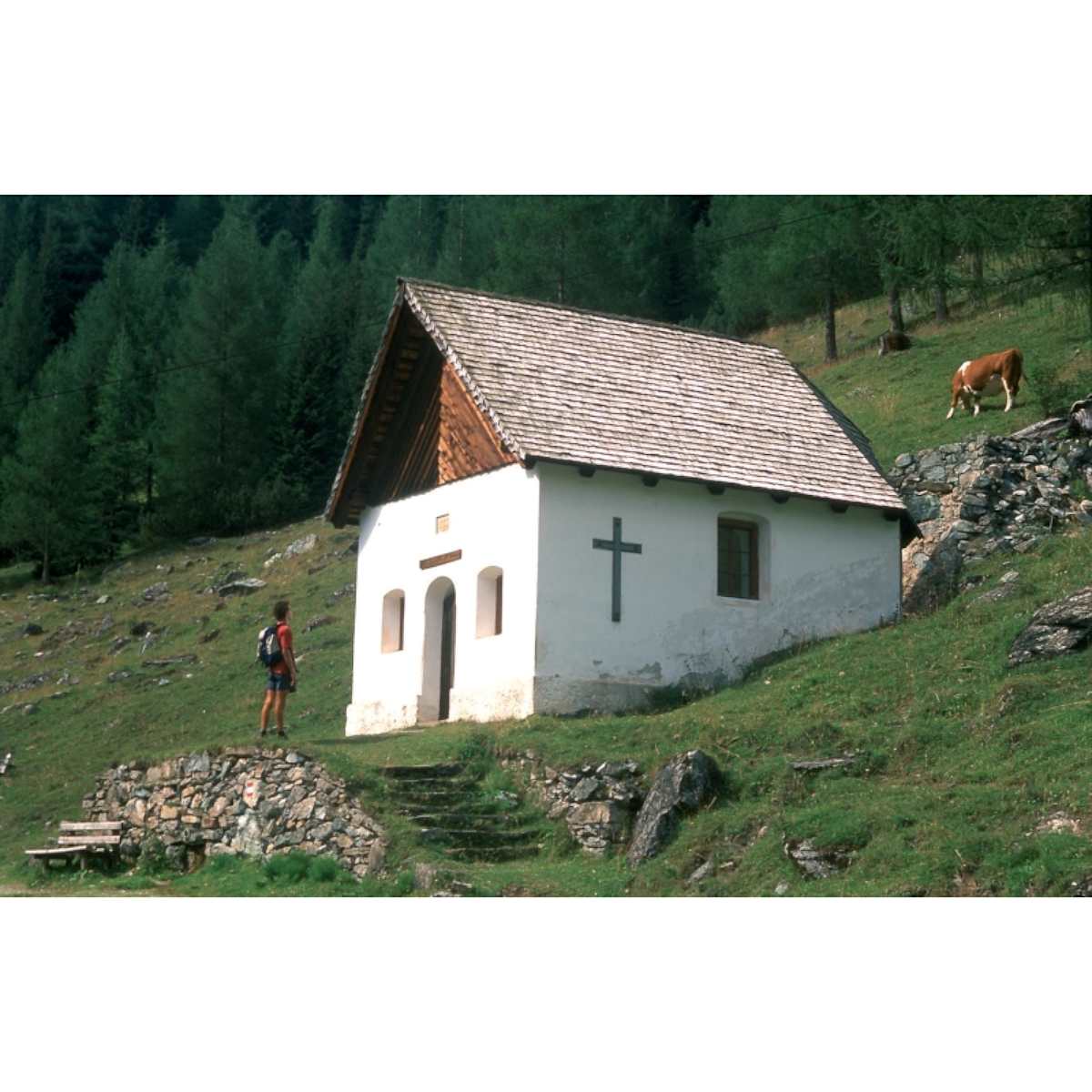 Von hier wandert man weiter auf einem sanft fallenden Almweg zur Sattelalpe. Nach der Aussichtskanzel kommt man zu einer weiteren Abzweigung: Rechts erreicht man in wenigen, aber steilen Kehren das ehemalige Gasthaus Kräuterwandstüberl, wo sich auch eine Haltestelle des Nationalpark-Wanderbusses befindet. Die Originalroute verläuft allerdings über den gerade weiter führenden „Haritzersteig“, der in leichtem Gefälle, zum Schluss die „Alte Glocknerstraße“ benützend, bis direkt ins Ortszentrum von Heiligenblut führt.