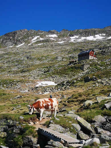 In vielen Kehren geht es weiter aufwärts in eine Scharte und auf der anderen Seite am Grat entlang bis zur Kattowitzer Hütte auf 2.321 m.