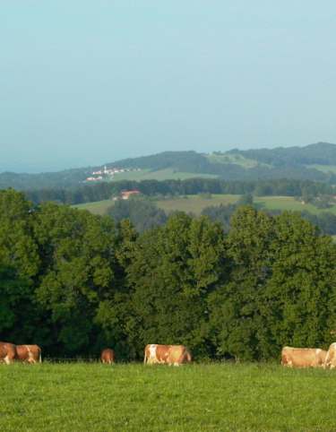 Man geht an der Kirche vorbei und geradeaus weiter entlang der Hänge des Mangfalltals. Auf diesem Weg bleiben, bis man in Grubmühle das Mangfallknie erreicht.