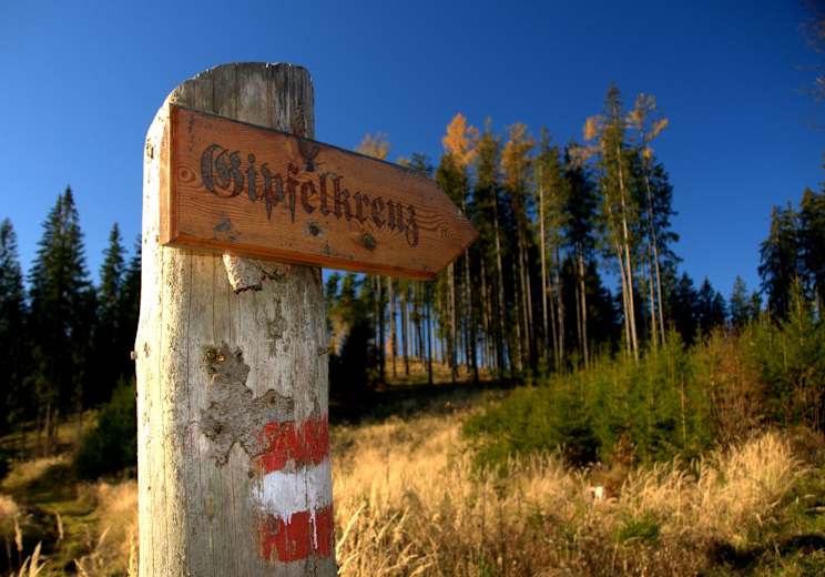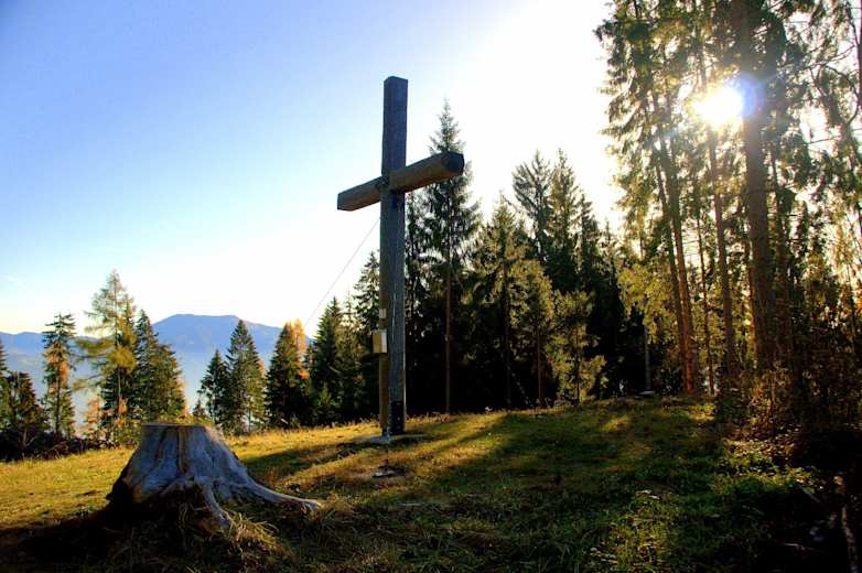 Nun bei einem Sendemasten linkshaltend bergauf (Holzschild „Gipfelkreuz") in wenigen Minuten zu eben diesem, aus Holz gezimmerten, Kreuz. Obwohl der Gipfel selbst teilweise bewaldet ist, eröffnen sich schöne Blicke in das Murtal, auf Rennfeld, Mugel und im Westen sogar bis zum Zirbitzkogel. Der Abstieg erfolgt auf der Aufstiegsstrecke oder entlang einer der Alternativwege, welche unter „Bergwelten Tipp“ angeführt sind.