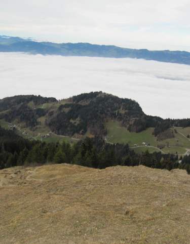 Vom Gipfel des Portlahorn erfolgt der Abstieg in Richtung Stofel (Grillplatz) und Oberdamülser Alpe. Auf einem breiten Weg geht es zurück nach Oberdamüls und anschließend ins Kirchdorf Damüls.