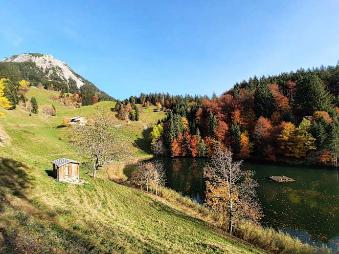 Retour geht es das erste Stück bis zur Bärenalpe wieder über den gleichen Weg. Bei der Bärenalpe zweigt nun der Weg nach links ab. Durch den Wald geht es über einen recht steilen Pfad entlang des Seewaldtobels hinunter Richtung Seewaldsee. Beim Seewaldsee bietet sich eine Einkehr und eine Umrundung des kleinen Naturjuwels an, bevor es dann die letzten Meter über die Straße wieder zurück zum Ausgangspunkt geht.