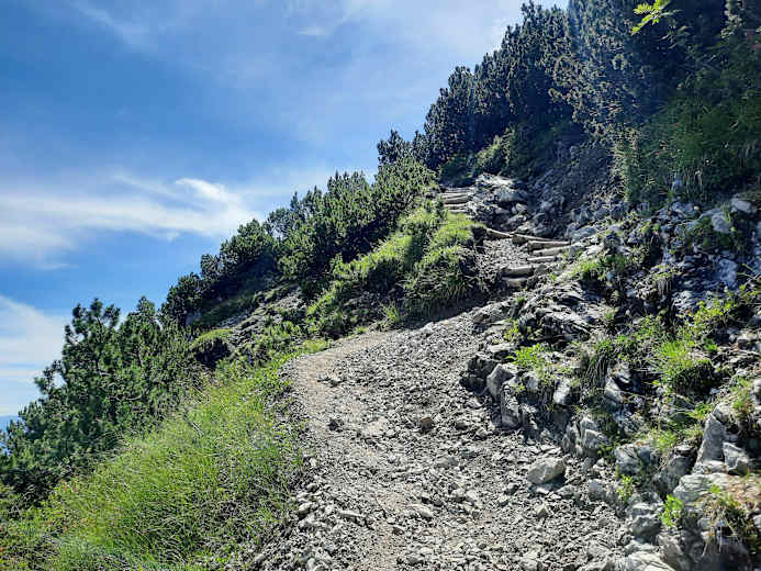 Der Abstieg erfolgt nach Südwesten zum Schillersattel. Hier nach links auf einem Wanderweg hinunter, dabei zweimal den Güterweg queren. Diesem dann folgen und über eine Wiese direkt zur Tschengla absteigen.