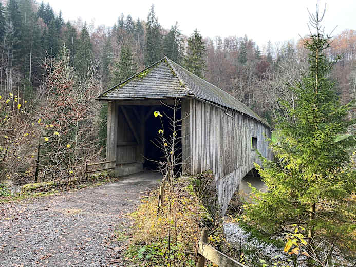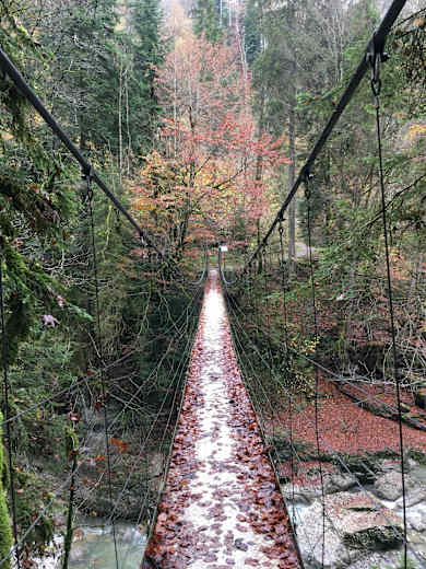 Familienfreundliche Wanderung im Bregenzerwald in Vorarlberg. Die Rundtour zwischen Egg und Lingenau bietet als Höhepunkte eine Hängebrücke aus Drahtseilen und eine alte gedeckte Holzbrücke im Gschwendtobel über die Subersach. Die insgesamt mittelschwere Route führt überwiegend über flache Wiesen, wobei zum Teil etwas steilere Auf- und Abstiege zu überwinden sind.