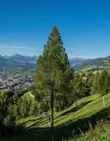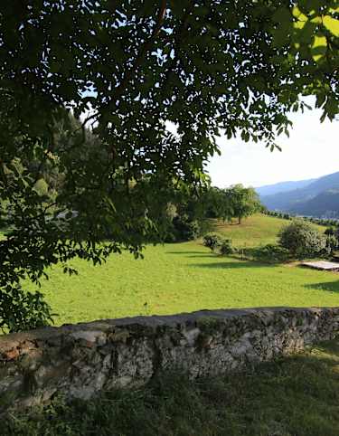 Der Ausgangspunkt der Wanderung am „Birmehlweg" befindet sich am Dorfplatz in Verdings. Von dort quert man die schönen Trockenrasenhänge an der Südseite des Kirchhügels und wandert zum Weiler Pardell hinab. Direkt an der Wegkreuzung zum „Keschtnweg" befindet sich der stattliche Bauernhof „Moar zu Viersch" mit seiner malerischen Kapelle und den schönen Apfelbäumen.